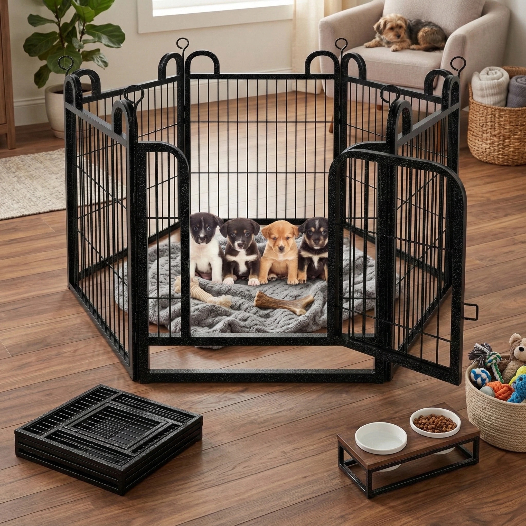 A pet fence is a safety device used to limit the movement of pets, typically made of durable mesh material or metal bars. It effectively protects pets, preventing them from escaping or entering unsafe areas. Pet fences are suitable for home yards, indoor spaces, or specific areas, helping owners manage their pets' activities and preventing injury or damage to property. Modern pet fences are diverse, with designs that are adjustable, foldable, and easy to install, making them both safe and convenient to use.